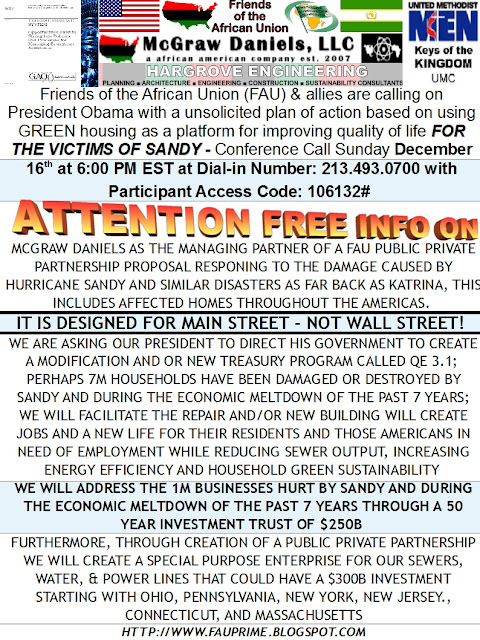 The 9 principals of Friends of the African Union [FAU] which where confirmed on 16 October 2012 at Dial-in Number: 213.493.0700 with Participant Access Code: 106132# at 9 AM EST. The proposed 9 operating principals of the FAU are:-